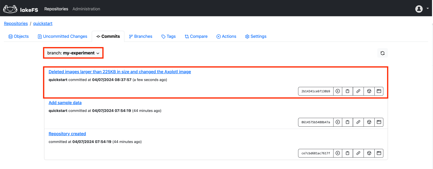 lakectl local commit -m 'Deleted images larger than 225KB in size and changed the Axolotl image' my_local_dir