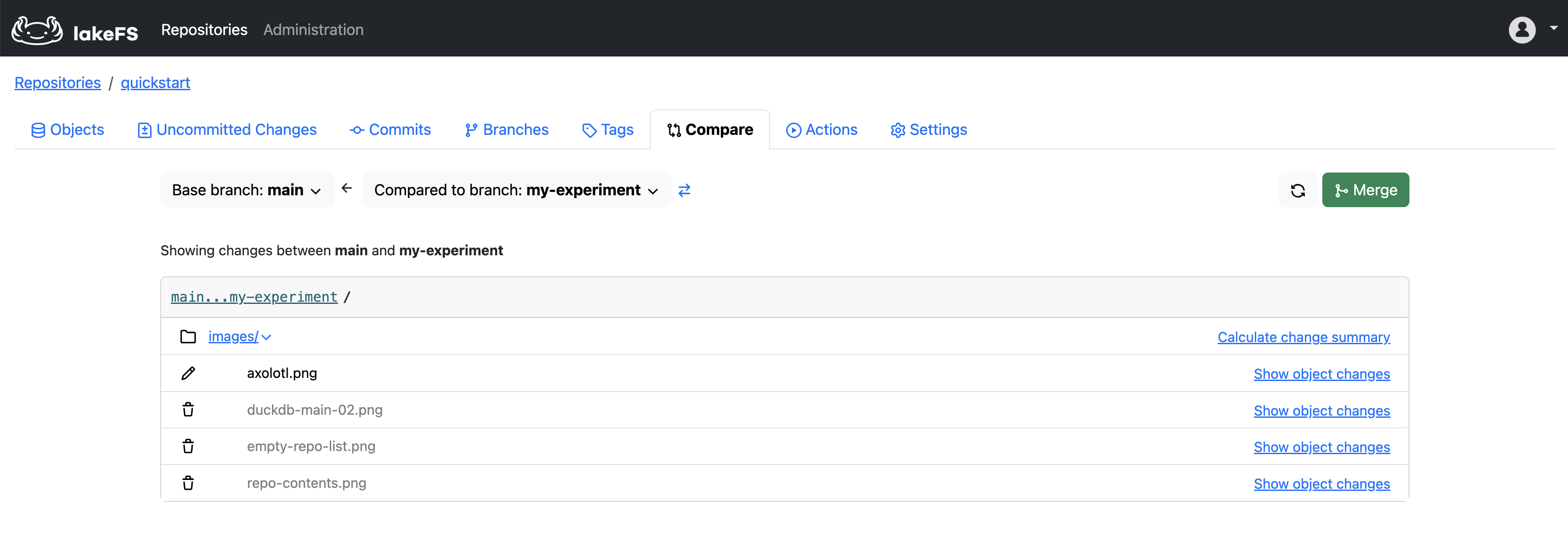 diff 'lakefs://quickstart/8614575b5488b47a094163bd17a12ed0b82e0bcbfd22ed1856151c671f1faa53/images/' <--> 'lakefs://quickstart/my-experiment/images/'...